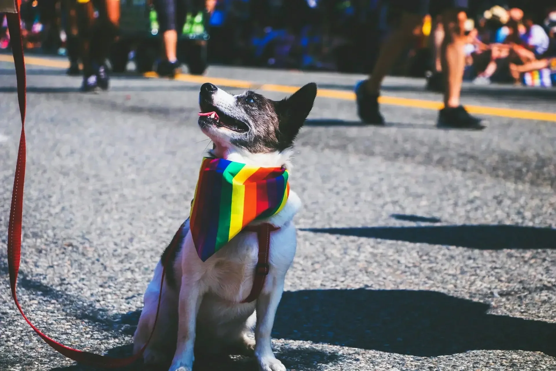 Walking calmly past people, dogs, patios, and parked cars